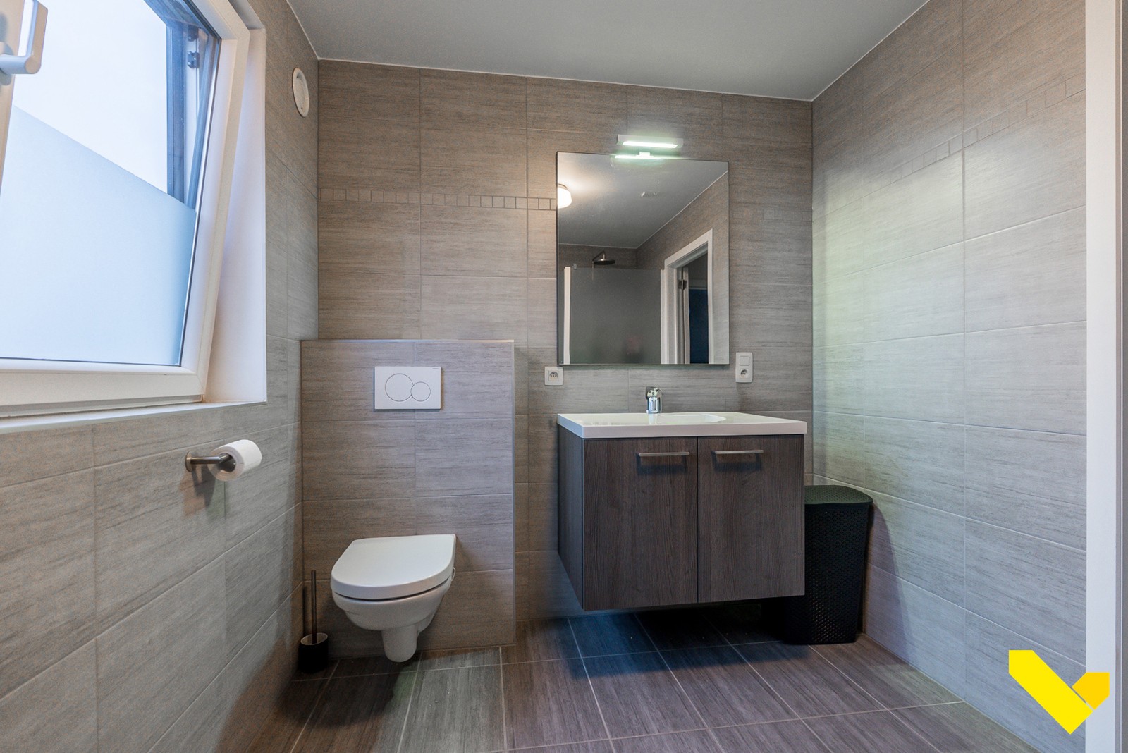 Op de bovenverdieping hebben we 2 slaapkamers en de badkamer. Deze is voorzien van een inloopdouche, een badkamermeubel en een toilet.