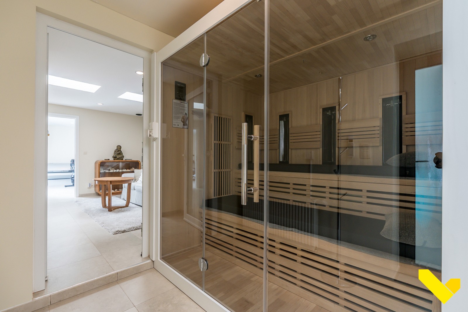 Vervolgens betreed je een echte oase; vanuit de sauna-ruimte met douche en gastentoilet kom je in een rustgevende bibliotheek en vervolgens in de fitnessruimte met toegang tot het zonneterras met grote jacuzzi.