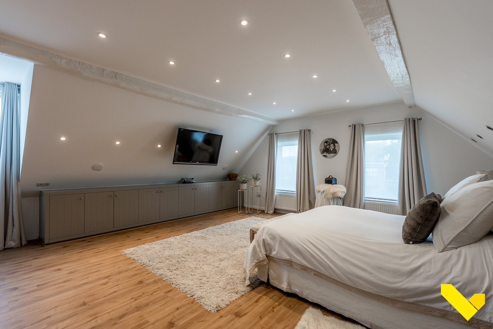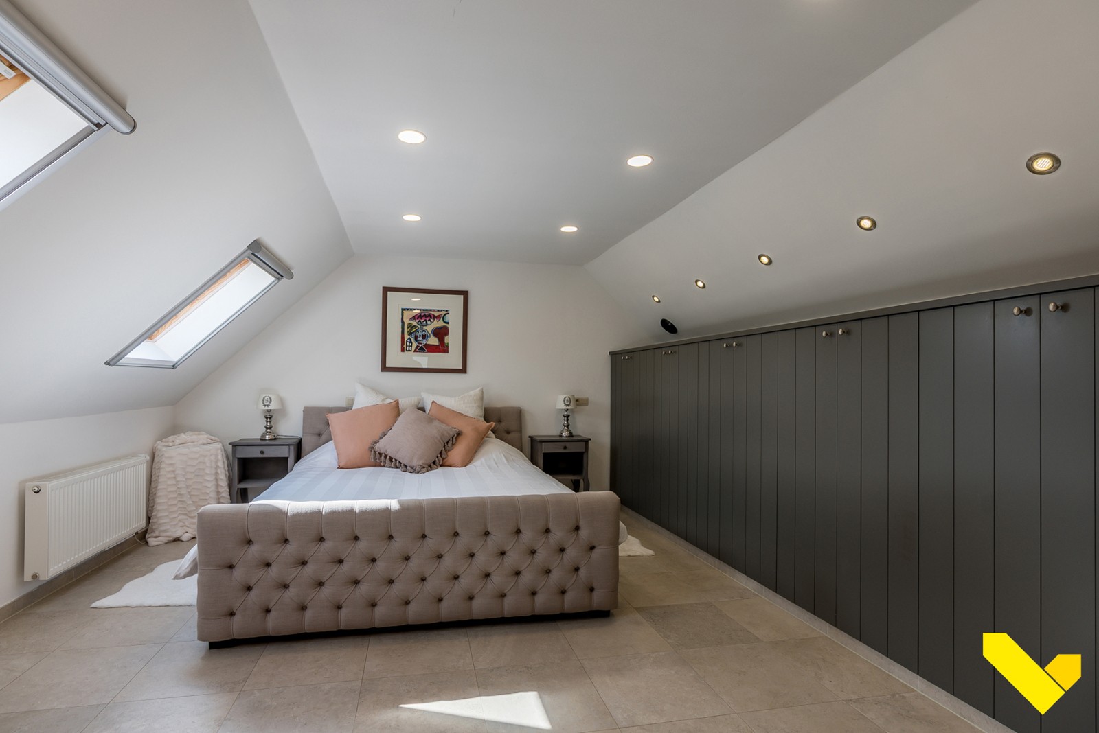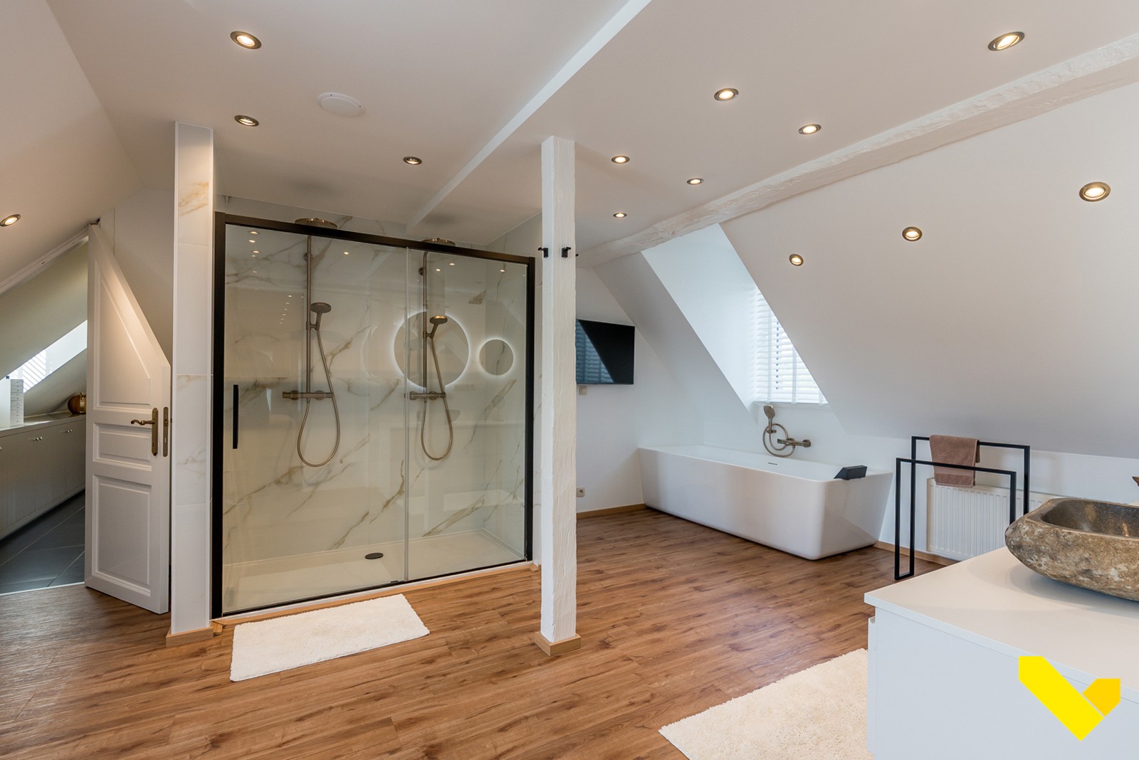 Via de keuken met zicht op de tuin kom je terecht in de unieke leefruimte, met toegang tot de bovenverdieping met een royale dressing (65 m²), een grote badkamer en de master bedroom.