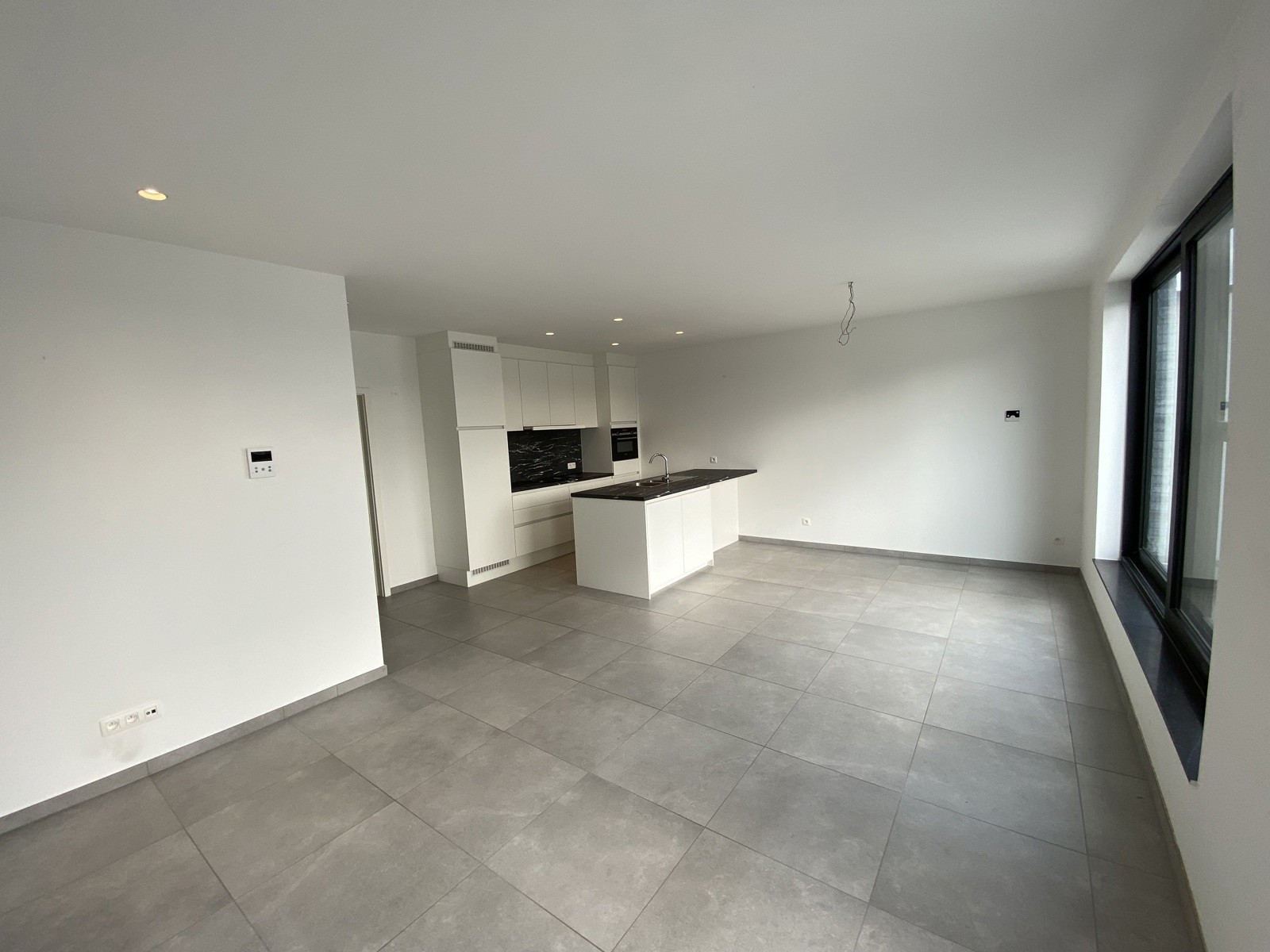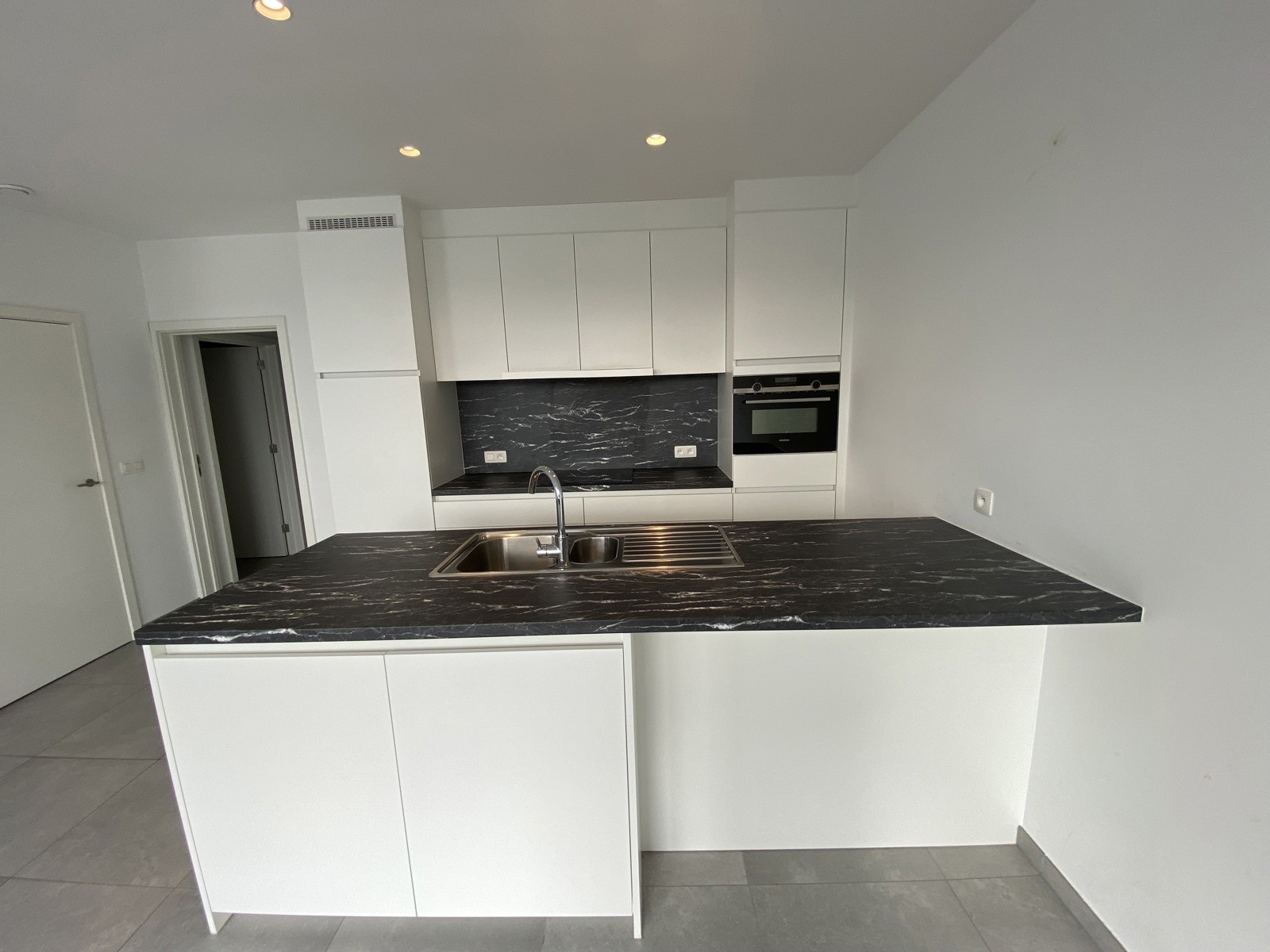 De lichtrijke woonkamer vormt samen met de open keuken het centrum van het appartement. De keuken is volledig uitgerust met een combi-oven, een vaatwasser, een koelkast, een kookplaat en een dampkap.. Aansluitend vinden we het terras, waar het heerlijk vertoeven is in de buitenlucht.