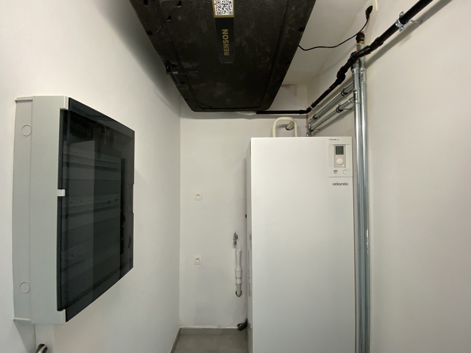 In de aparte berging is er ruimte voorzien voor een wasmachine en droogkast, en bevindt zich ook de warmtepomp, wat bijdraagt aan de energiezuinigheid van de woning.